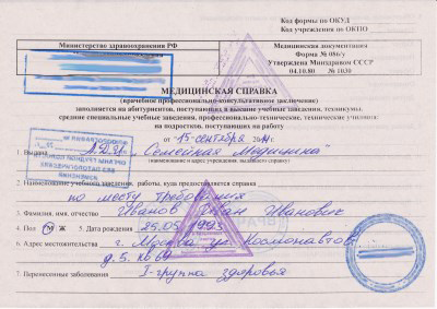 Плюс Вам нужно пройти ряд обследований и сдать анализы и флюорографию. Данный перечень специалистов терпит изменения в зависимости от работы на которую Вы претендуете. Где-то может понадобится осмотр нарколога, где-то психиатра. Женщинам к этому списку добавляют гинеколога и соответствующие женские анализы. Заключающим этапом обследования является печать и подпись главврача больницы в которой было проведено обследование.