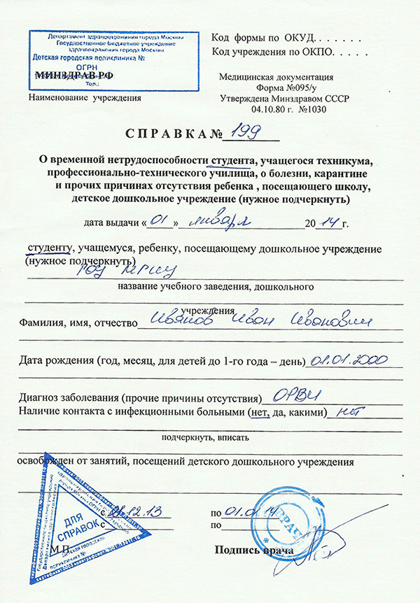 Студентам справку о болезни необходимо получить в поликлинике также. Иногда студенты идут на такой шаг, так как они устроились на подработку и нужны дополнительные деньги или просто необходимо съездить в отпуск или к родным. Имея справку 095/у Вам удастся закрыть все пропуски без лишних проблем и вопросов. За оформлением документов Вы можете обратиться к нам.